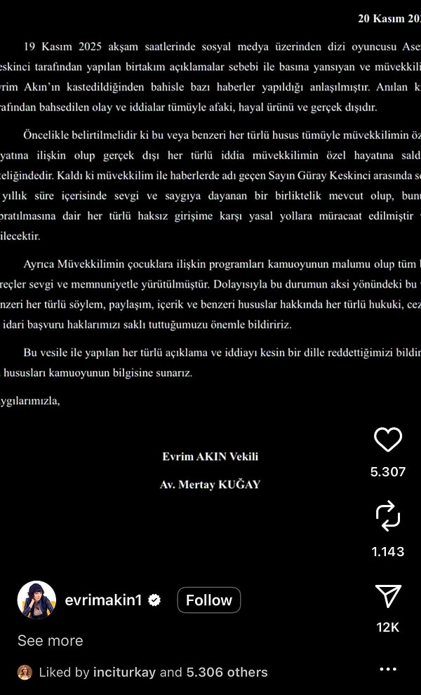 Bu esnada tartışmanın merkezinde duran Evrim Akın, avukatı aracılığıyla paylaştığı açıklamada Asena Keskinci’nin anlattığı tüm olayları kesin bir lisanla yalanlamıştı. Metinde, lisana getirilen savların gerçeği yansıtmadığı, kişilik haklarına ve özel hayatına yönelik ağır bir hücum olduğu vurgulayan ve sürecin hukuksal olarak takip edileceği belirtilen Akın ayrıyeten özel hayatına dair konuşulanlar için de sevgi ve hürmete dayalı bir bağ yaşadığını, bunun üzerinden yürütülen söylentileri ise açık bir yıpratma eforu olarak gördüğünü tabir etmişti.