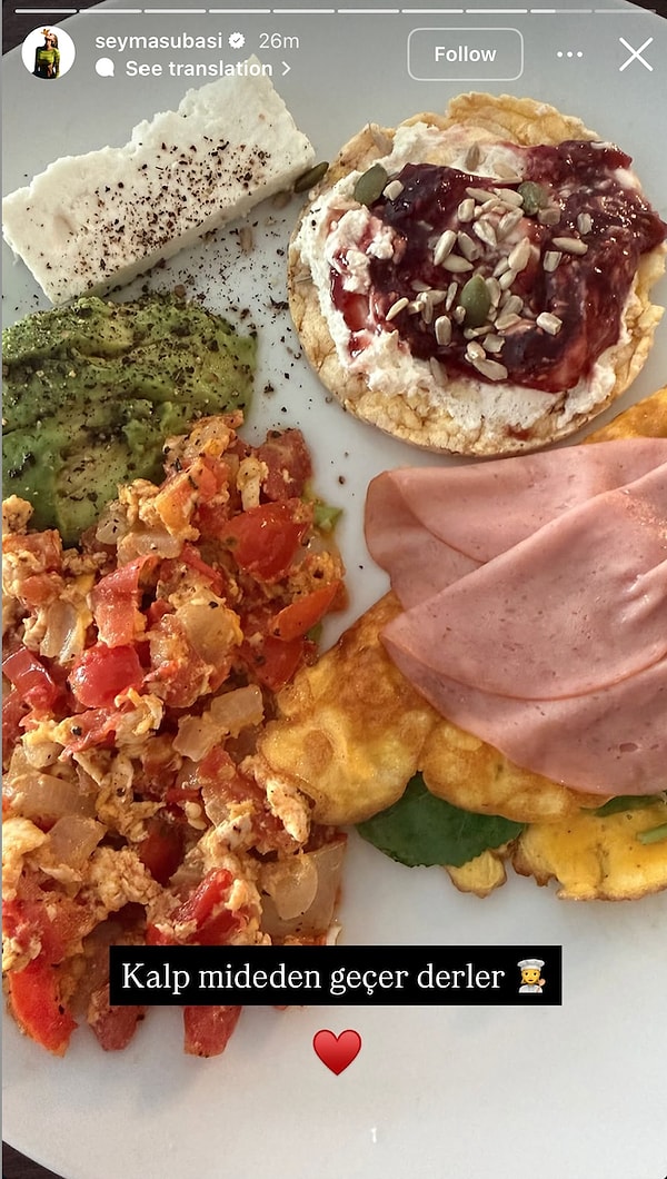 Son devirde özel hayatı kadar “sağlıklı yaşam” paylaşımlarıyla da gündemde olan Şeyma Subaşı, avokadolu, peynirli, omletli kocaman kahvaltı tabağının üzerine “Kalp mideden geçer derler” yazılı notuyla kalp emojisi kondurdu.