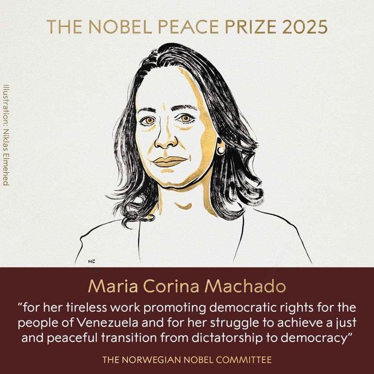 Son dakika…2025 Nobel Barış Ödülü’nün sahibi, bayan aday eski Venezuela Ulusal Meclis üyesi Marina Corina Machado olduğu açıklandı.