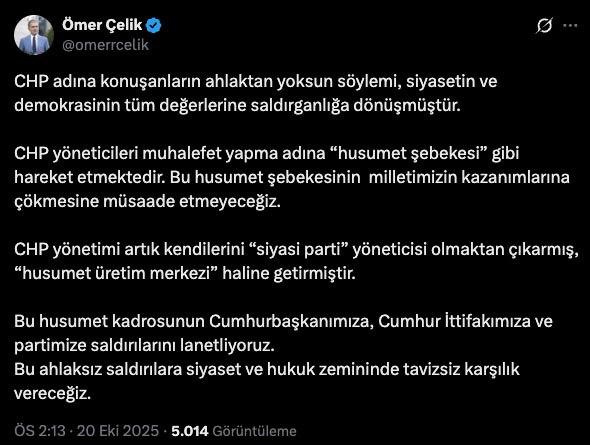 SON DAKİKA HABERLERİ… AK Parti Sözcüsü Ömer Çelik, toplumsal medya platformu X‘teki hesabından yaptığı paylaşımda, Cumhuriyet Halk Partisi (CHP) idaresine yönelik sert tenkitlerde bulundu.