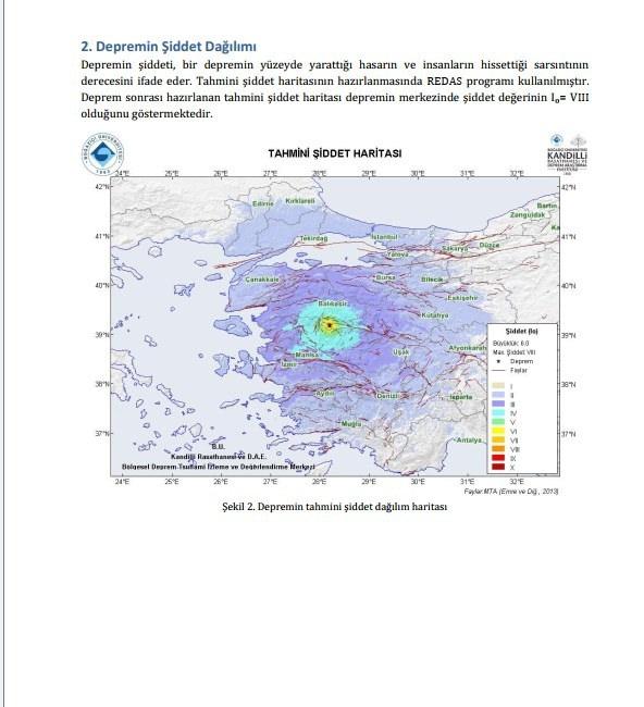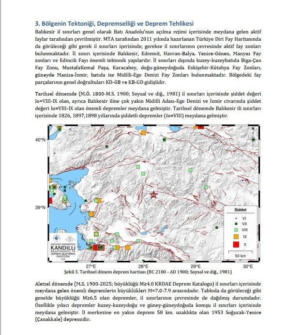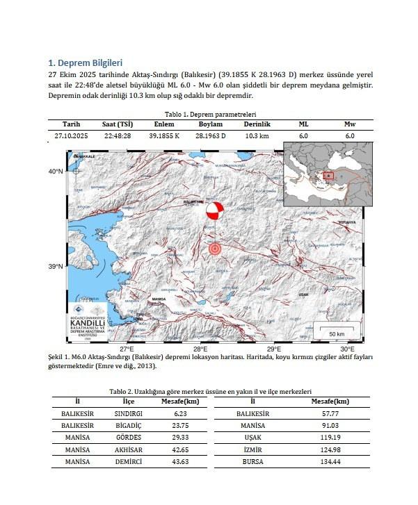 Kandilli dün yaşanan 6,1 büyüklüğündeki zelzeleye ait de bir açıklama yaptı. Yapılan açıklamada, “27 Ekim 2025 tarihinde Aktaş-Sındırgı (Balıkesir) (39.1855 K 28.1963 D) merkez üssünde lokal saat ile 22:48’de aletsel büyüklüğü ML 6.0 – Mw 6.0 olan şiddetli bir zelzele meydana gelmiştir. Zelzelenin odak derinliği 10.3 km olup sığ odaklı bir sarsıntıdır. Zelzele sonrası hazırlanan iddiası şiddet haritası zelzelenin merkezinde şiddet kıymetinin Iₒ= VIII olduğunu göstermektedir. İlgili zelzelenin odak sistem tahlili olağan (eğim atımlı) fay özelliği göstermektedir.” denildi.