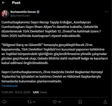 “Cumhurbaşkanımız Sayın Recep Tayyip Erdoğan, Azerbaycan Cumhurbaşkanı Sayın İlham Aliyev’in davetine icabetle, Gebele’de düzenlenecek Türk Devletleri Teşkilatı 12. Zirvesi’ne katılmak üzere 7 Ekim 2025 tarihinde Azerbaycan’ı ziyaret edeceklerdir.