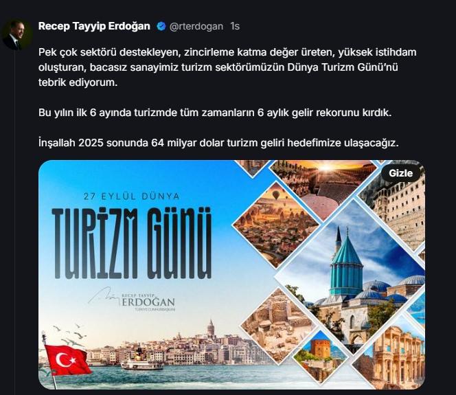 Son dakika… Cumhurbaşkanı Recep Tayyip Erdoğan, NSosyal hesabından, Dünya Turizm Günü münasebetiyle bir bildiri paylaştı.