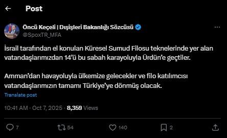 Keçeli, ABD merkezli X şirketinin toplumsal medya platformundaki hesabından yaptığı paylaşımda, “İsrail güçlerince el konulan Global Sumud Filosu teknelerinde yer alan vatandaşlarımızdan 36’sı, 4 Ekim günü gerçekleştirilen özel uçak seferiyle ülkemize sağ salim dönmüştü. Hala İsrail’de tutulan 14 vatandaşımızın, yarın Ürdün üzerinden ülkemize gelebilmeleri için çalışmalarımız sürüyor.” bilgisini paylaşmıştı.