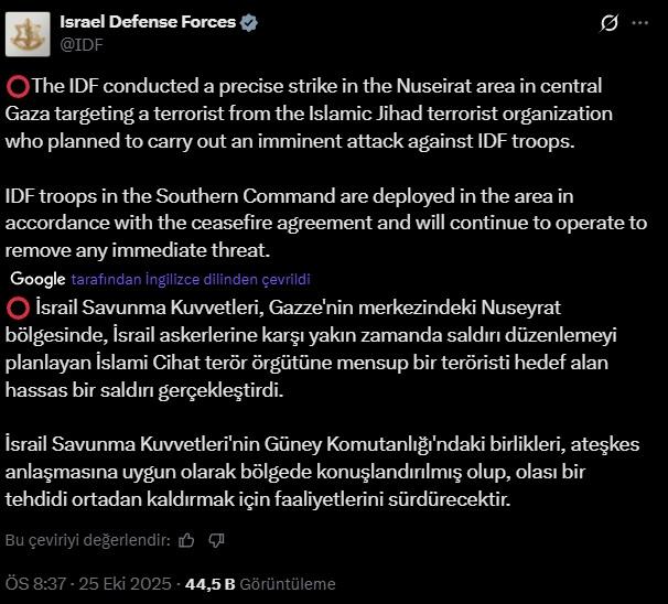 İsrail Savunma Kuvvetleri (IDF), İslami Cihad mücahitlerinin İsrail askerlerine atak hazırlığında olduğunu tez ederek Gazze’nin merkezindeki Nuseyrat bölgesine hava saldırısı düzenlediklerini açıkladı.