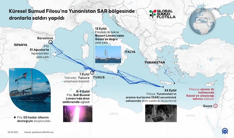 Yunanistan’dan Gazze’ye insani yardım ulaştırmak için yola çıkan Global Sumud Filosu’na, Yunanistan’ın arama-kurtarma (SAR) sorumluluk alanında dronlarla hücum düzenlenmişti.