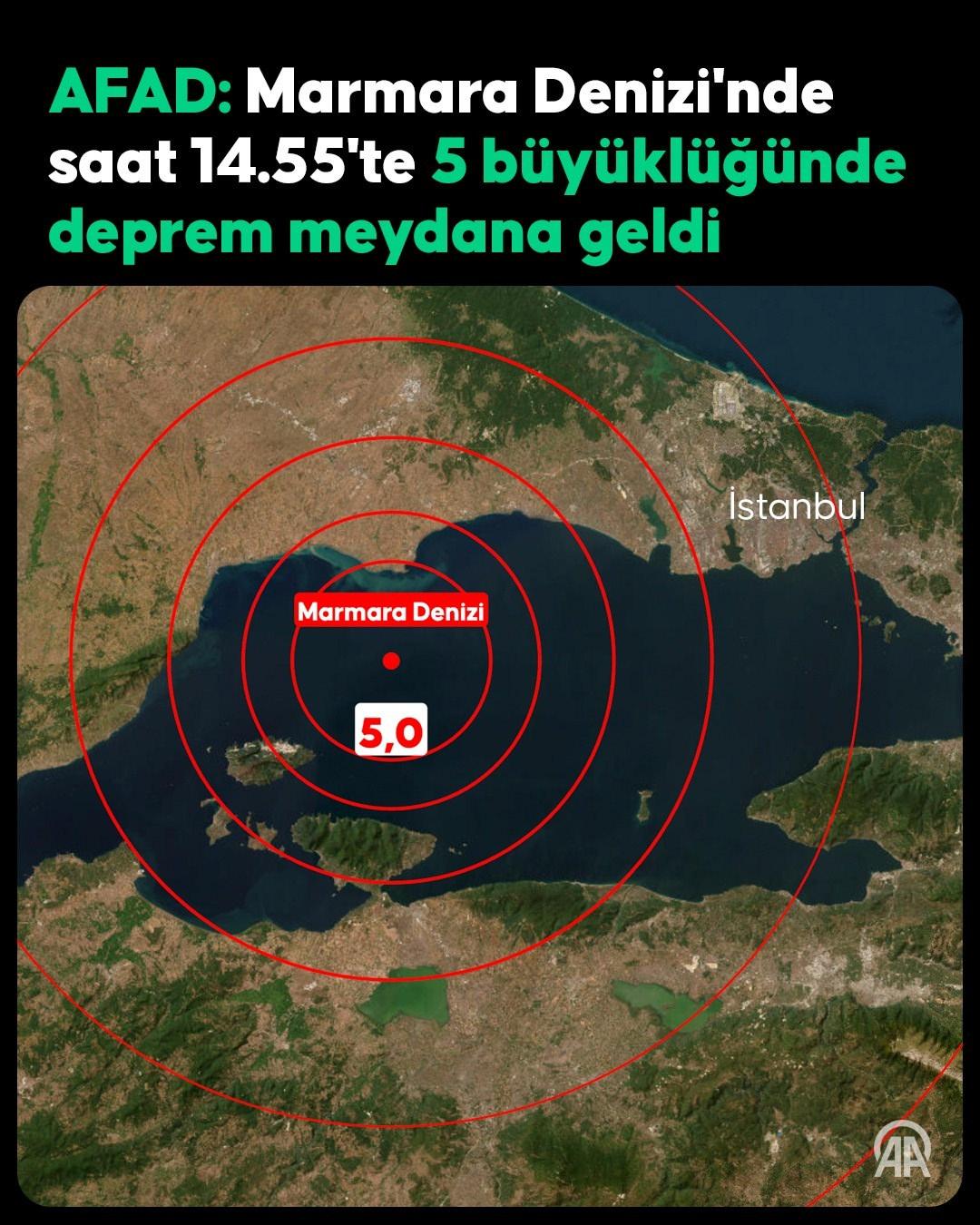 AFAD, “Marmara Denizi’nde, Marmaraereğlisi Tekirdağ açıklarında, saat 14.55’te 5.0 büyüklüğünde bir zelzele meydana geldi. Gelişmeleri takip etmekteyiz.” açıklamasında bulundu.