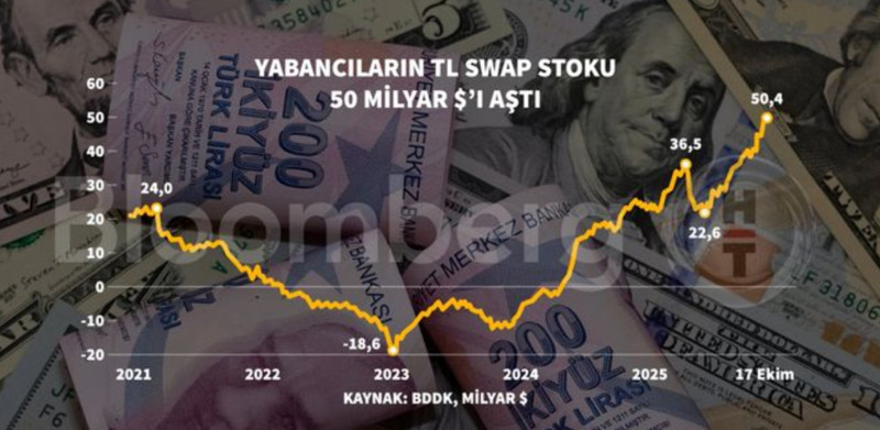 17 Ekim ile biten haftada, BDDK’nın “bankalar bilanço dışı yabancı para pozisyonu” (BDYPP) verisinde TL (alım) swap durumları 47,2 milyar dolar olurken, TCMB’nin bilgilerindeki karşıt swap durumları da 3,2 milyar dolara çıktı. Toplam türev durum büyüklüğüyse 50,4 milyar dolar ile 50 milyar dolar eşiğinin üzerine çıktı. Eylül sonunda bu sayı 41 milyar dolar düzeyinde olmuştu.