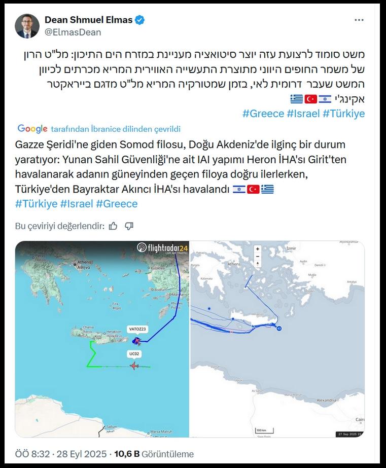 “Gazze Şeridi’ne giden Sumud filosu, Doğu Akdeniz’de enteresan bir durum yaratıyor: Yunan Kıyı Güvenliği’ne ilişkin IAI üretimi Heron İHA’sı Girit’ten havalanarak adanın güneyinden geçen filoya yanlışsız ilerlerken, Türkiye’den Bayraktar Akıncı İHA’sı havalandı”