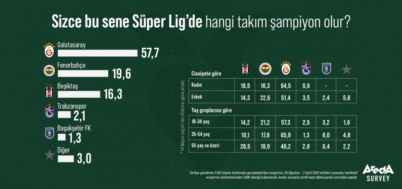 İştirakçilerin yüzde 57,7’si bu sezon Süper Lig şampiyonu olarak Galatasaray’ı gösterdi. Sarı-kırmızılıları, yüzde 19,6 ile Fenerbahçe ve yüzde 16,3 ile Beşiktaş takip etti. Trabzonspor’un şampiyon olacağını düşünenlerin oranı yüzde 2,1, Başakşehir için ise yüzde 1,3 olarak araştırmaya yansıdı.