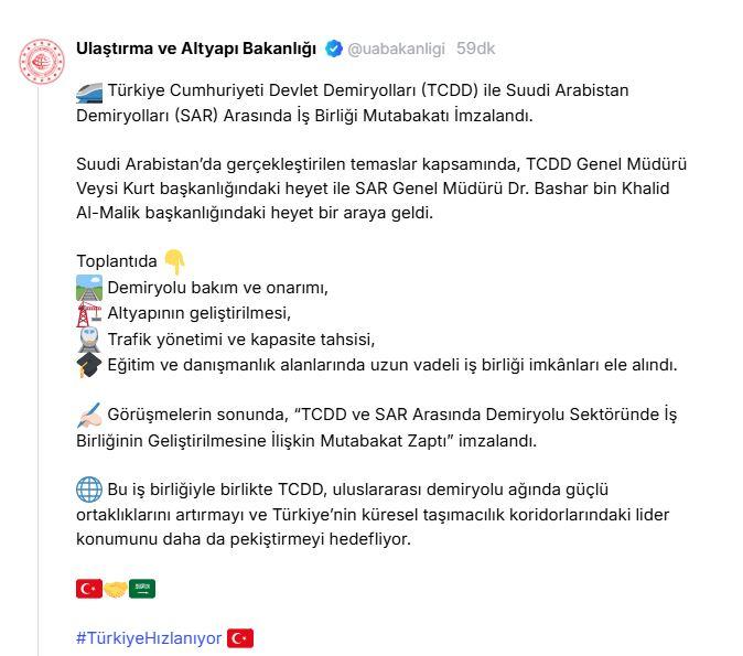 “Toplantıda, demir yolu bakım ve tamiri, altyapının geliştirilmesi, trafik idaresi ve kapasite tahsisi, eğitim ve danışmanlık alanlarında uzun vadeli işbirliği imkanları ele alındı. Görüşmelerin sonunda, ‘TCDD ve SAR Ortasında Demir Yolu Dalında İşbirliğinin Geliştirilmesine Ait Mutabakat Zaptı’ imzalandı. Bu işbirliğiyle TCDD, memleketler arası demir yolu ağında güçlü iştiraklerini artırmayı ve Türkiye’nin global nakliyecilik koridorlarındaki başkan pozisyonunu daha da pekiştirmeyi hedefliyor.”
