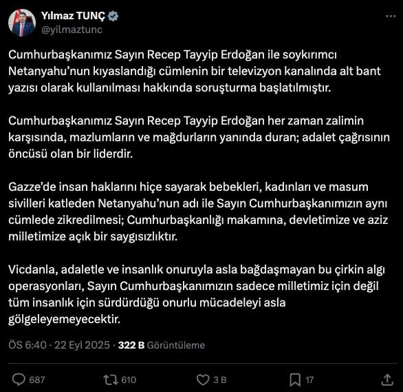 Bakan Tunç, X hesabından yaptığı paylaşımda, Cumhurbaşkanı Recep Tayyip Erdoğan ile İsrail Başbakanı Binyamin Netanyahu’nun kıyaslandığı cümlenin alt bantta kullanılması hakkında süreç başlatıldığını belirtmişti.