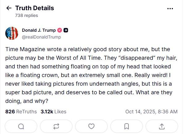Derginin seçtiği fotoğrafı hiç beğenmeyen Trump, Truth hesabından yayınladığı bir gönderi ile mecmuayı eleştirdi.