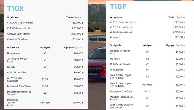 Anahtar teslim fiyatı T10F 4More için 3.133.641 TL, T10X 4More Obsidiyen özel seri için 3.233.641 TL olarak açıklandı.