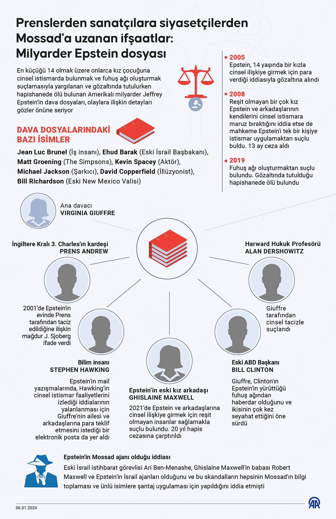 En küçüğü 14 olmak üzere 18 yaş altındaki onlarca kız çocuğuna cinsel istismarda bulunmak ve fuhuş ağı oluşturmak suçlamasıyla yargılanan Epstein, tutuklu olduğu New York Manhattan Metropolitan Merkez Hapishanesi’ndeki hücresinde 10 Ağustos 2019’da meyyit bulunmuştu.Açıklanan Epstein dava evraklarında Prens Andrew, ABD Başkanı Donald Trump, eski ABD Lideri Bill Clinton, eski İsrail Başbakanı Ehud Barak, eski ABD Lider Yardımcısı Al Nazaran, aktör Kevin Spacey, müzikçi Michael Jackson, illüzyonist David Copperfield, avukat Alan Dershowitz ve eski New Mexico Valisi Bill Richardson üzere ünlü isimler yer almıştı.