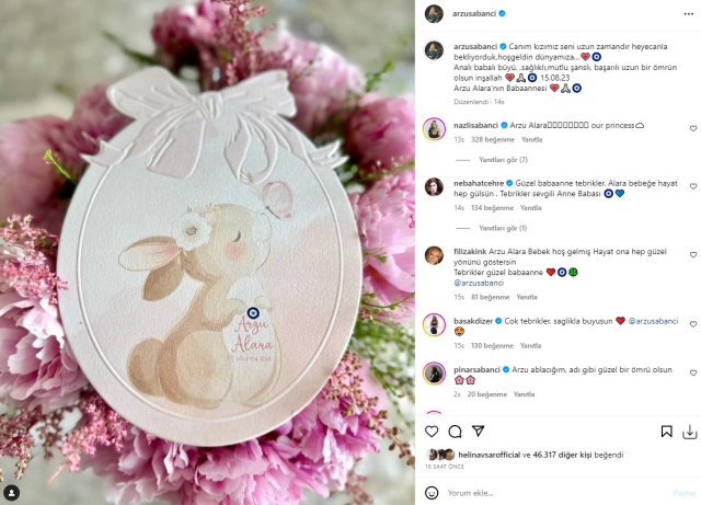 Instagram hesabından yaşadığı mutluluğu paylaşan Arzu Sabancı, “Canım kızımız seni uzun zamandır heyecanla bekliyorduk, hoş geldin dünyamıza. Analı babalı büyü, sağlıklı, mutlu şanslı, başarılı uzun bir ömrün olsun inşallah. 15.08.23. Arzu Alara’nın babaannesi” dedi. Torununa kendi adını verdiği için çok mutlu olduğunu söyleyen Sabancı, “Bana yaptıkları sürprizle beni çok duygulandırıp, gururlandırıp, çok mutlu ettiler. Adı uğurlu olsun. Kızımız sağlıklı, analı babalı büyüsün inşallah. Benim de ilk adım babaannemin adı Fehmiye Arzu. Alara’ya da babaanne adı uğurlu gelsin inşallah” ifadelerini kullandı.