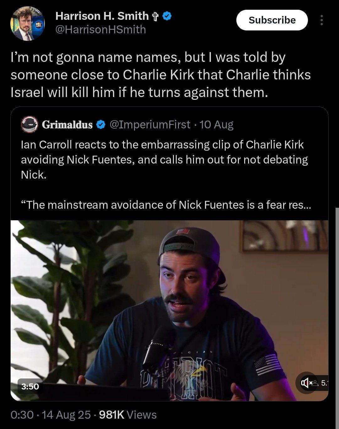 ABD Infowars sunucusu ve toplumsal medya içerik üreticisi Harrison H. Smith ise 1 ay evvel X hesabından yaptığı bir paylaşımda “İsim vermeyeceğim fakat Charlie Kirk’e yakın biri bana, Charlie’nin İsrail’e karşı gelirse onu öldüreceğini düşündüğünü söyledi” dediği de ortaya çıktı.