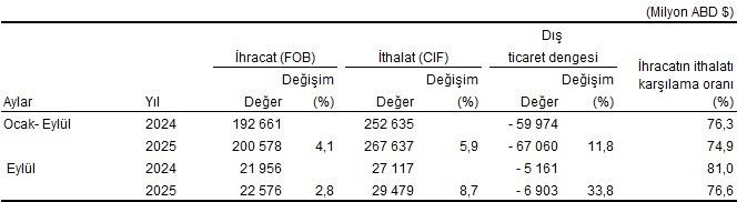 Türkiye İstatistik Kurumu ile Ticaret Bakanlığı iş birliğiyle genel ticaret sistemi kapsamında üretilen süreksiz dış ticaret bilgilerine nazaran; ihracat 2025 yılı Eylül ayında, bir evvelki yılın birebir ayına nazaran yüzde 2,8 artarak 22 milyar 576 milyon dolar, ithalat yüzde 8,7 artarak 29 milyar 479 milyon dolar olarak gerçekleşti.