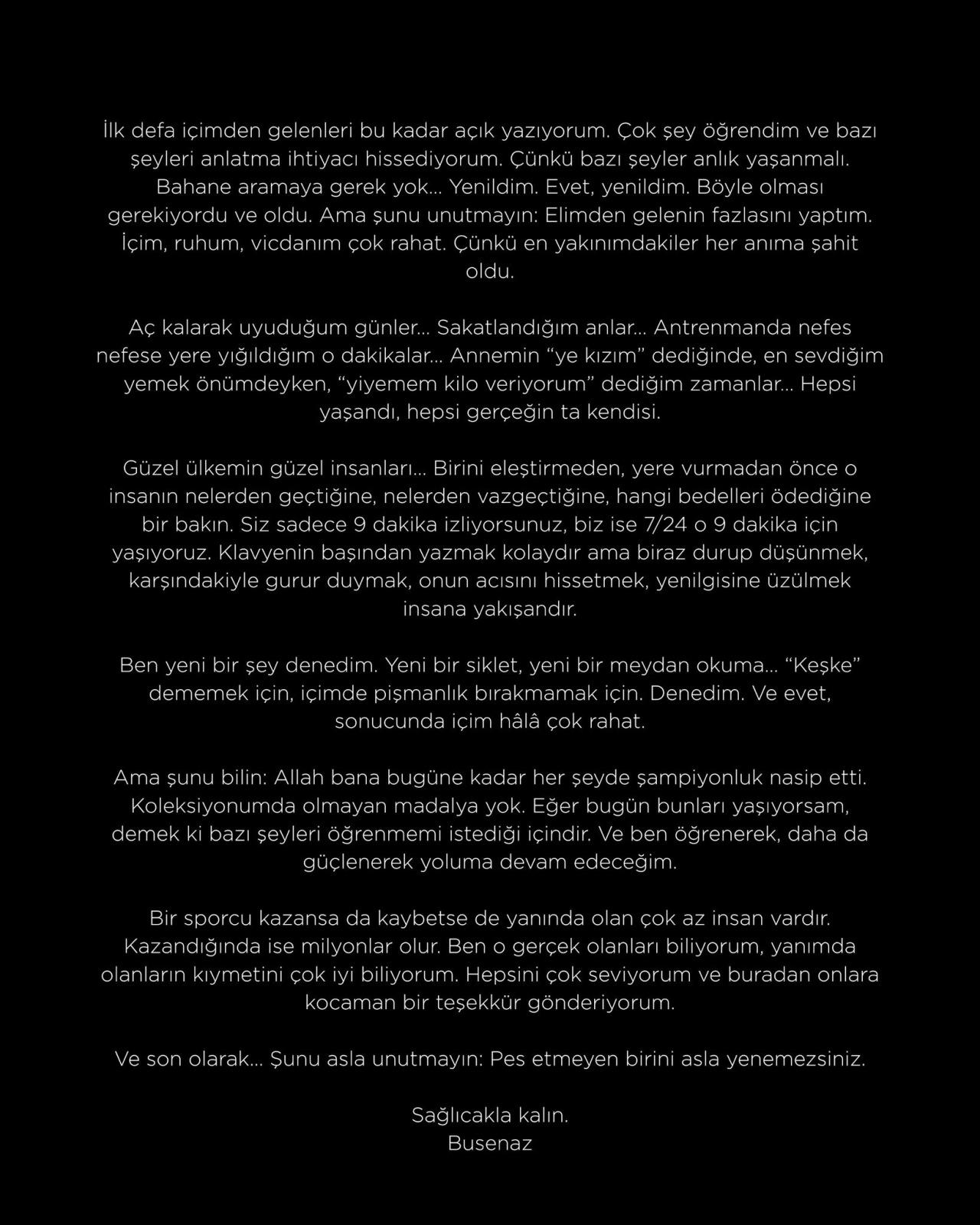 Bir sportmen kazansa da kaybetse de yanında olan çok az insan vardır. Kazandığında ise milyonlar olur. Ben o gerçek olanları biliyorum, yanımda olanların değerini çok uygun biliyorum. Hepsini çok seviyorum ve buradan onlara kocaman bir teşekkür gönderiyorum. Son olarak şunu asla unutmayın: Pes etmeyen birini asla yenemezsiniz.”
