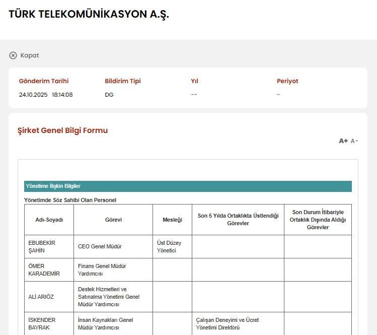 Türk Telekom KAP’a yaptığı açıklamada Genel Müdür olarak Ebubekir Şahin’in atandığını açıkladı.