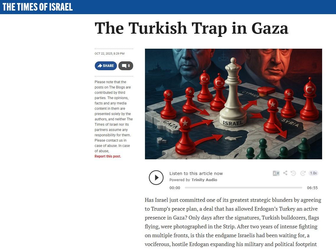 İsrailli yayın organı The Times of Israel, 22 Ekim 2025 tarihinde müellif ve analist Ariel Harkham’ın “Gazze’deki Türk Tuzağı” başlıklı köşe yazısına yer verdi.