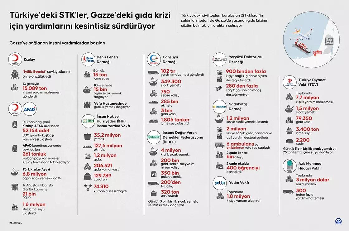 Deniz Feneri Derneği, ise Gazze’de kurulan 10 aşevi aracılığıyla her gün 15 bin bireye sıcak yemek dağıtımı gerçekleştiriyor.