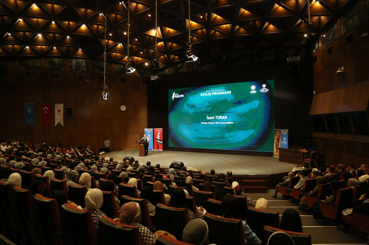 Türkiye Diyanet Vakfı (TDV) Genel Müdürü İzani Turan, “İlk Ders: Filistin” programının açılış konuşmasında akademik yıl açılışını sevinçle yapamamanın hüznünü yaşadıklarını lisana getirdi. Turan, “Hepimiz yürekten yaralıyız. Önemli bir biçimde mahcubiyetle icra ettiğimiz bir programın açılışını yapıyoruz. Keşke ‘Ey gençler, sizi yeryüzünde memnun bir gelecek ve hayat bekliyor. Sizleri özgür, adaletin, merhametin, sevginin ve şefkatin hakim olduğu, zulmün olmadığı bir dünyaya yelken açmak üzere yetiştiriyoruz. Siz de o gemiye katkı sağlayan yolcular olacaksınız’ diyerek başlayabilseydim.” sözlerini kullandı.