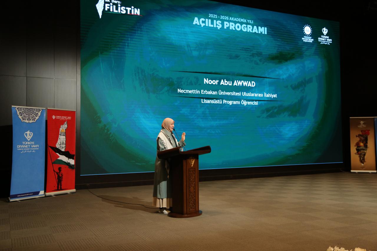 Necmettin Erbakan Üniversitesi Milletlerarası İlahiyat Lisansüstü Programı öğrencisi Noor Abu Awwad, programda yaptığı konuşmada “Sorumluluğumuz çok büyük. Yalnızca üzülmek yetmez; bu üzüntüyü gerçek bir çalışmaya dönüştürmeliyiz. Her birimiz, kendi yetenekleri doğrultusunda ümmete yararlı olacak biçimde gayret göstermeliyiz.” dedi.