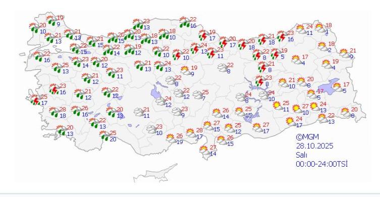 İstanbul’da bugün ve yarın gök gürültülü kuvvetli sağanak var, çarşamba az bulutlu. Ankara ve İzmir’de ise bugün hava modüllü bulutlu olacak. Yarın her iki kentte de gök gürültülü sağanak bekleniyor. En yüksek sıcaklık İzmir’de 26, İstanbul’da 25, Ankara’da 24 derece.