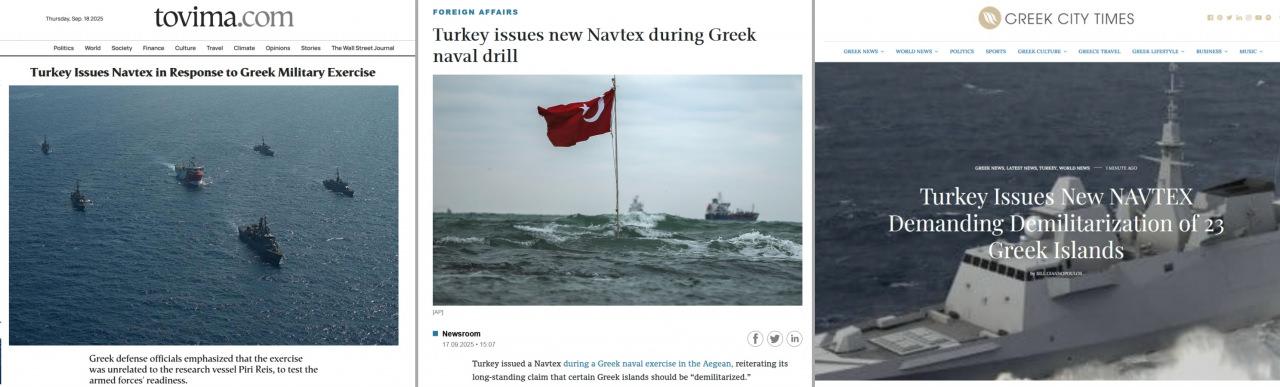 NAVTEX’te, Taşoz, Midilli, Sakız, Rodos, Meis dahil toplam 23 ada sayıldı. Türkiye, bu adaların 1914 Londra Konferansı, 1923 Lozan Antlaşması ve 1947 Paris Barış Antlaşması ile askerden arındırıldığının altı çizildi.