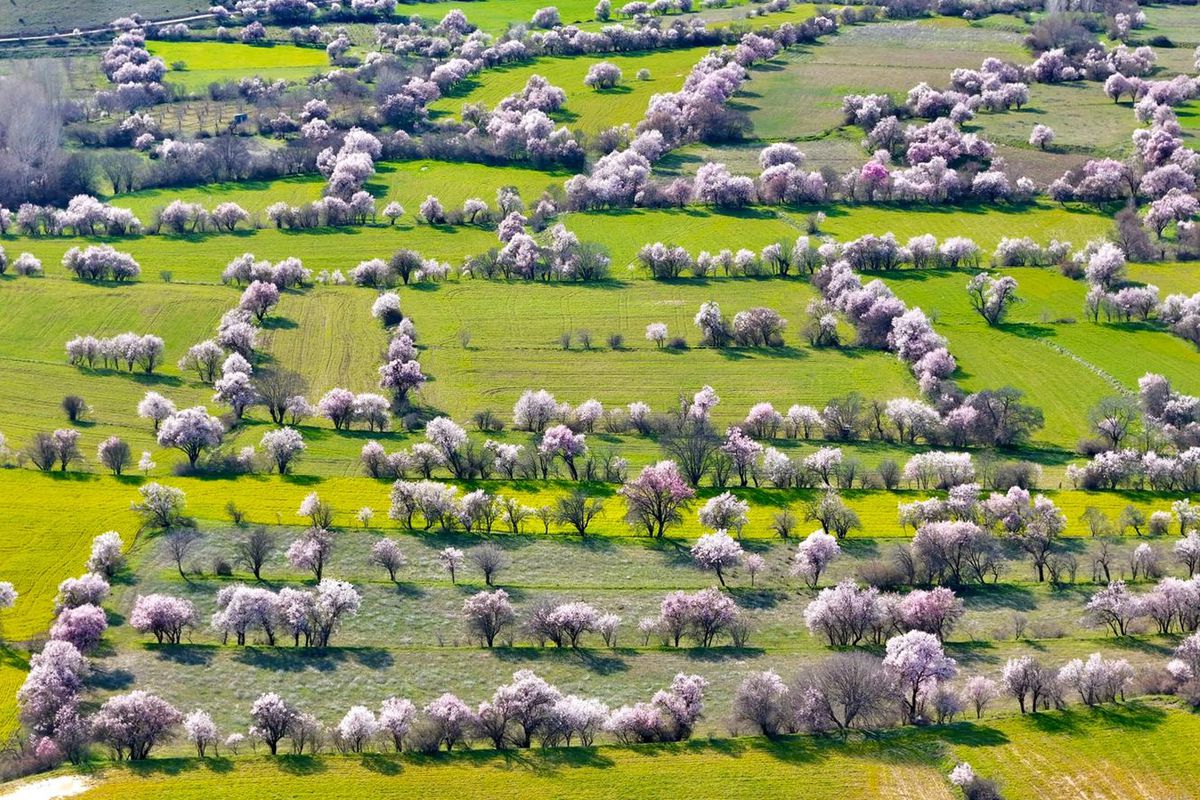 Baharın habercisi olarak görülen badem çiçekleri, ilçe sakinleri ve fotoğraf tutkunlarının ilgisini çekerken, oluşan manzara dron ile havadan da görüntülendi.