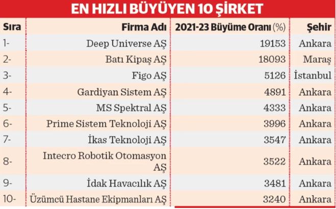 Türkiye 100’de birinci sıraya cirosunu iki yılda yüzde 19 bin 153 oranında artıran Ankara merkezli Deeptech Universe Savunma ve Bilişim Teknolojileri AŞ yerleşti. İkinciliği yüzde 18 bin 93 büyüme oranıyla Kahramanmaraş firması Batı Kipaş Kağıt Sanayi ve Ticaret AŞ alırken, İstanbul merkezli Figo Ticari Bilgi ve Uygulama Platformu AŞ ise yüzde 5 bin 126 büyüme oranıyla üçüncü oldu. En süratli büyüyen 10 şirketin 8’inin Ankara merkezli olması dikkat çekti. Ayrıyeten birinci 10’da yapay zekâ, e-ticaret, bilişim teknolojileri ve robotik sistemler üzere şirketlerin bulunması teknoloji odaklı yatırımların sürat kazandığının bir göstergesi olarak yorumlandı.