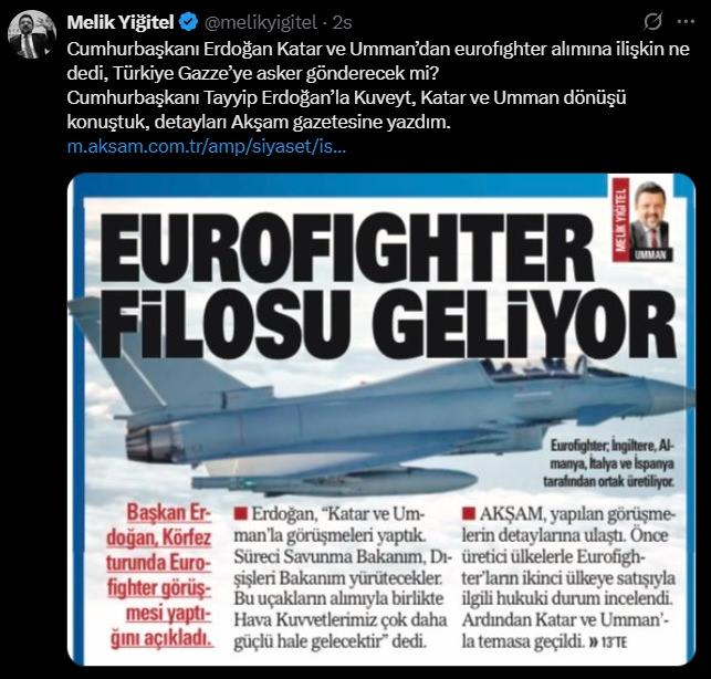 Akşam gazetesinde Türk Medya Ankara Temsilcisi Melik Yiğitel’in haberine nazaran; Katar ve Umman’dan Eurofighter alımıyla ilgili etaplar şöyle sonuca ulaştırıldı: