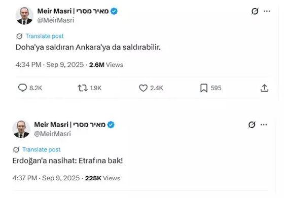 Masri’nin tehditleri bununla da sonlu kalmadı. Cumhurbaşkanı Recep Tayyip Erdoğan’a yönelik de Türkçe bir paylaşım yaparak “Erdoğan’a nasihat: Etrafına bak!” tabirlerini kullandı. Devamında ise “Bugün Katar, yarın Türkiye” paylaşımı yaptı ve Erdoğan’ın, İsrail’in daha evvel İran’da öldürdüğü Hamas lideri İsmail Haniye ile el sıkıştığı fotoğrafı yayımladı.