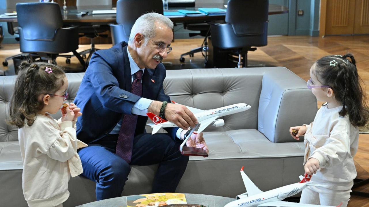 Ulaştırma ve Altyapı Bakanı Abdulkadir Uraloğlu, babalarıyla birlikte uçak inişlerini izlerken kaydedilen imajlarıyla büyük beğeni toplayan ikiz kardeşler Erva ve Zümra’yı Ulaştırma ve Altyapı Bakanlığı’nda ağırladı. Şimdi 4,5 yaşında olmalarına karşın gökyüzüne duydukları ilgiyle dikkati çeken kardeşlerin ziyareti, sıcak ve samimi anlara sahne oldu.