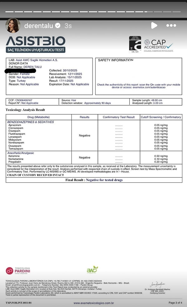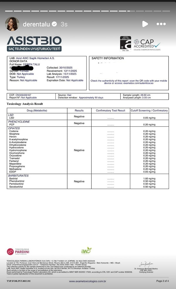 Deren Talu, Instagram’dan uyuşturucu testi sonucunun evrakını yayınladı.