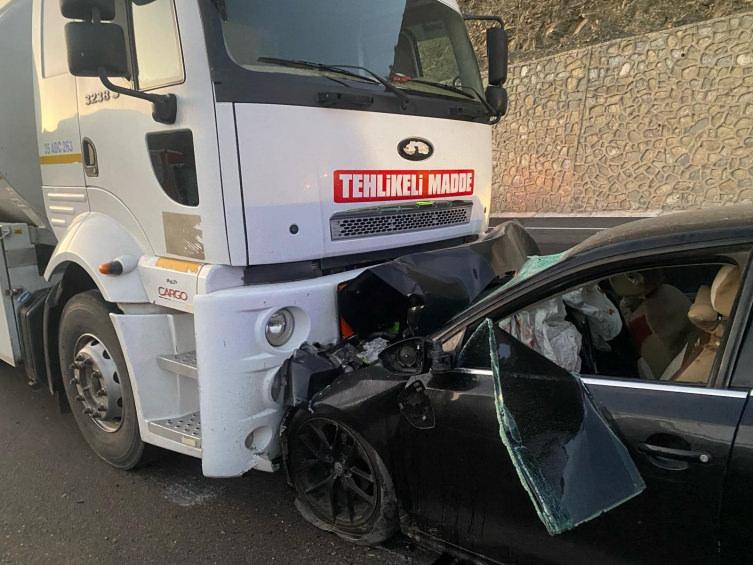 YAKIT TANKERİ, KARŞI YANDAN GELEN OTOMOBİL  BAŞ BAŞA ÇARPIŞTI