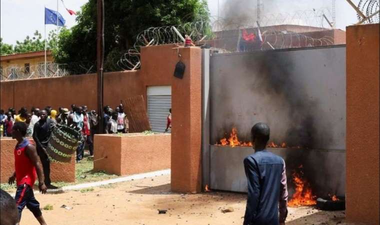 Similar to events in neighboring Burkina Faso in September last year following a coup, some protesters tried to climb the embassy walls, while others stomped on burning French flags.