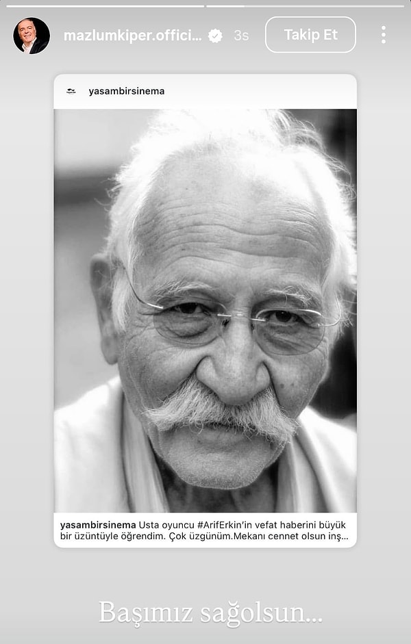 90 yaşında olan Arif Erkin, geçtiğimiz haftalarda doğum günü kutlamasıyla gündem olmuştu. Ani vefat haberiyle büyük hüzün yaşatan usta oyuncuyu Yabancı Damat oyuncuları unutmadı. Yabancı Damat dizisindeki rol arkadaşları, Arif Erkin Güzelbeyoğlu’nun vefatının akabinde toplumsal medyada taziye paylaşımları yaptı.