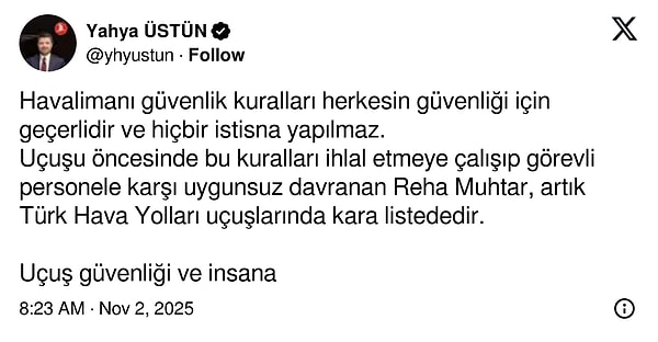 Uçuşu öncesinde bu kuralları ihlal etmeye çalışıp vazifeli işçiye karşı uygunsuz davranan Reha Muhtar, artık Türk Hava Yolları uçuşlarında kara listededir.