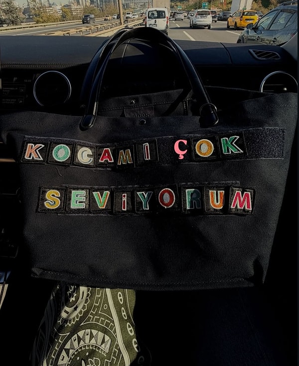 Çantasının üstündeki ‘Kocamı çok seviyorum’ yazısıyla kocam köylülükte tepe yapan Burcu Esmersoy’a mutluluklar ve kaç aşk dolu yıllar diliyoruz. Aman dikkat edin, nazar değmesin!