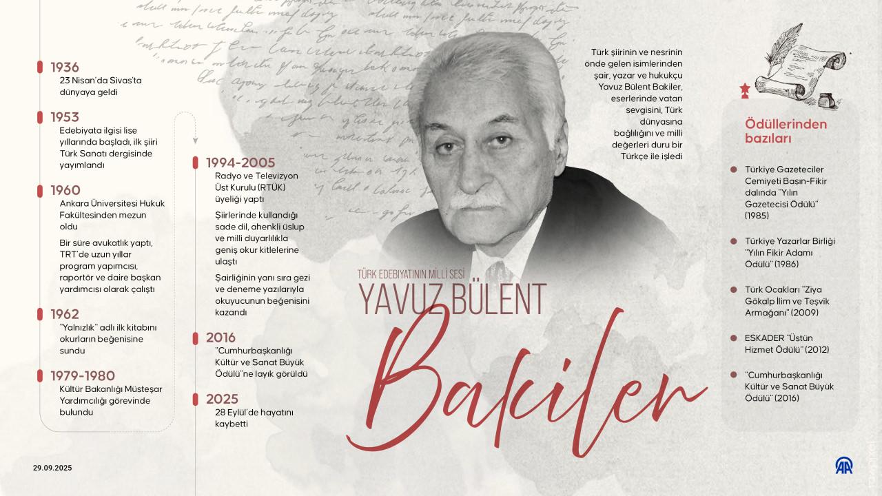 Türk edebiyatının müstesna isimlerinden şair ve müellif Yavuz Bülent Bakiler, 89 yaşında vefat etti.