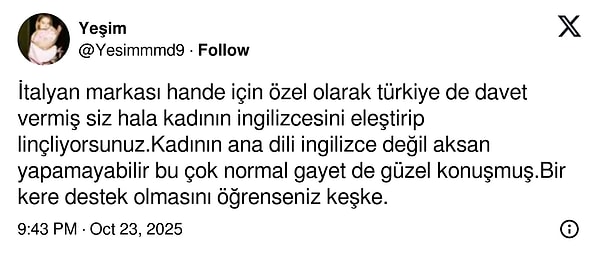 Hande Erçel, dün gece İtalyan markasının grubunu Çırağan’da ağırladı. Konuklarına İngilizce yaptığı “Hoş geldiniz” konuşması ise tartışma yarattı.