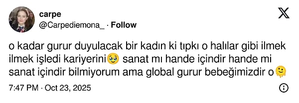 Mimar Sinan Üniversitesi, Hoş Sanatlar Fakültesi’nde Halı-Kilim kısmında okuyan Hande Erçel’in Türkiye’nin dokuma sanatını marka elçisi olarak dünyaya tanıtması büyük övgü toplamıştı.