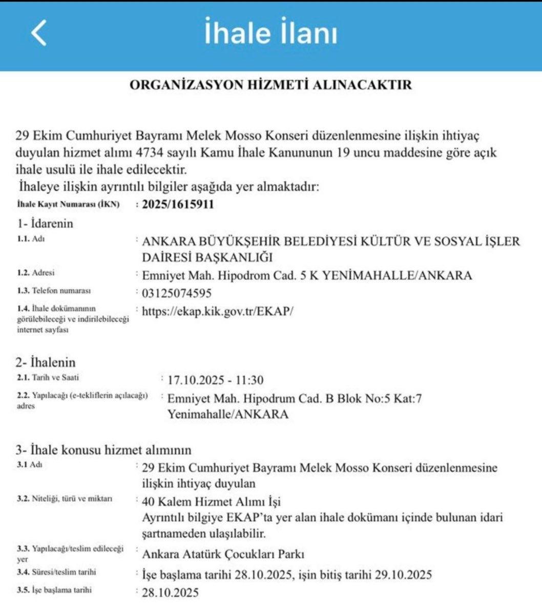 Melek Mosso konserinin 2025/1615911 no’lu ihaleyle gerçekleştirileceği belirtildi.