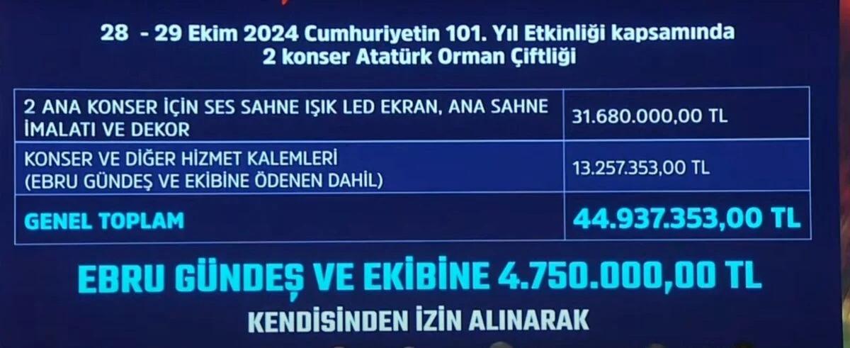 Ankara Büyükşehir Belediyesi ise 29 Ekim 2024’te iki gün süren konser aktifliği kapsamında toplam 44 milyon 937 bin TL harcamıştı.