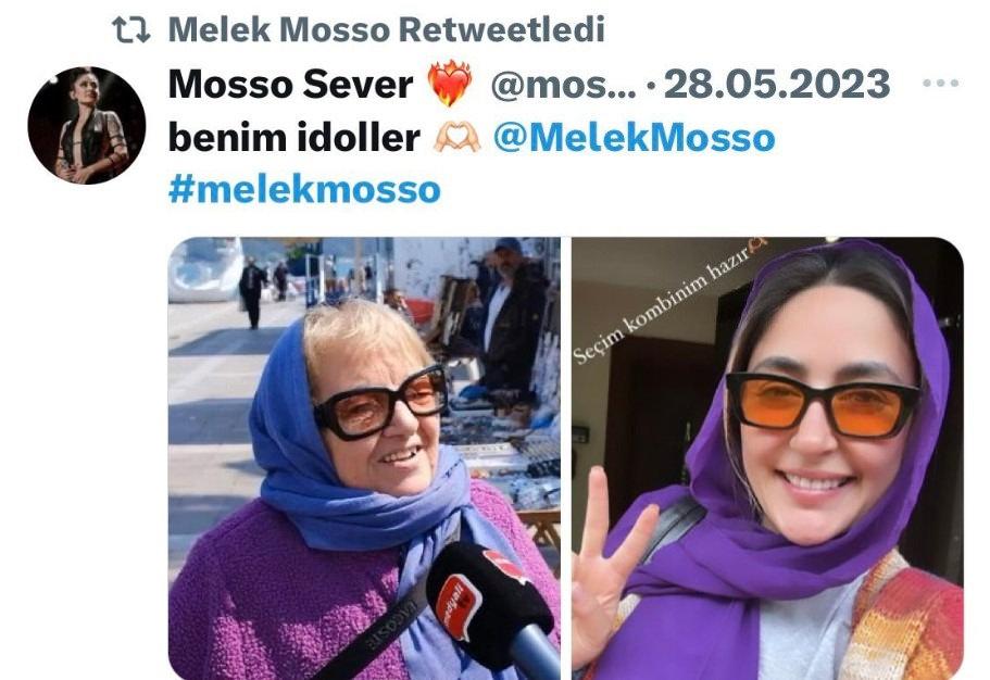 CHP belediyelerinin müzikçisi Melek Mosso, AK Parti’li bayanlara ‘o….u’ diyerek küfreden bayanı sahiplenmişti. Mosso, 2023 seçimlerinde oy kullanmaya giderken küfürbaz bayanla tıpkı renk tülbent ve gözlük takmıştı. “Benim idoller” paylaşımıyla küfürcü bayanla tıpkı biçim kıyafet giydiğini duyurmuştu.