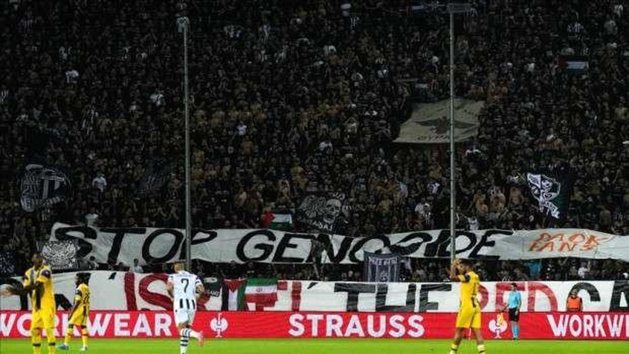 Selanik’in Toumba Stadı’nda oynanan müsabakada İsrail’in işgali altındaki Gazze’ye takviye veren mesken sahibi grubun taraftarları tribünde “Soykırımı durdur” ve “İsrail’e kırmızı kart göster” yazılı pankartlara yer verdi.
